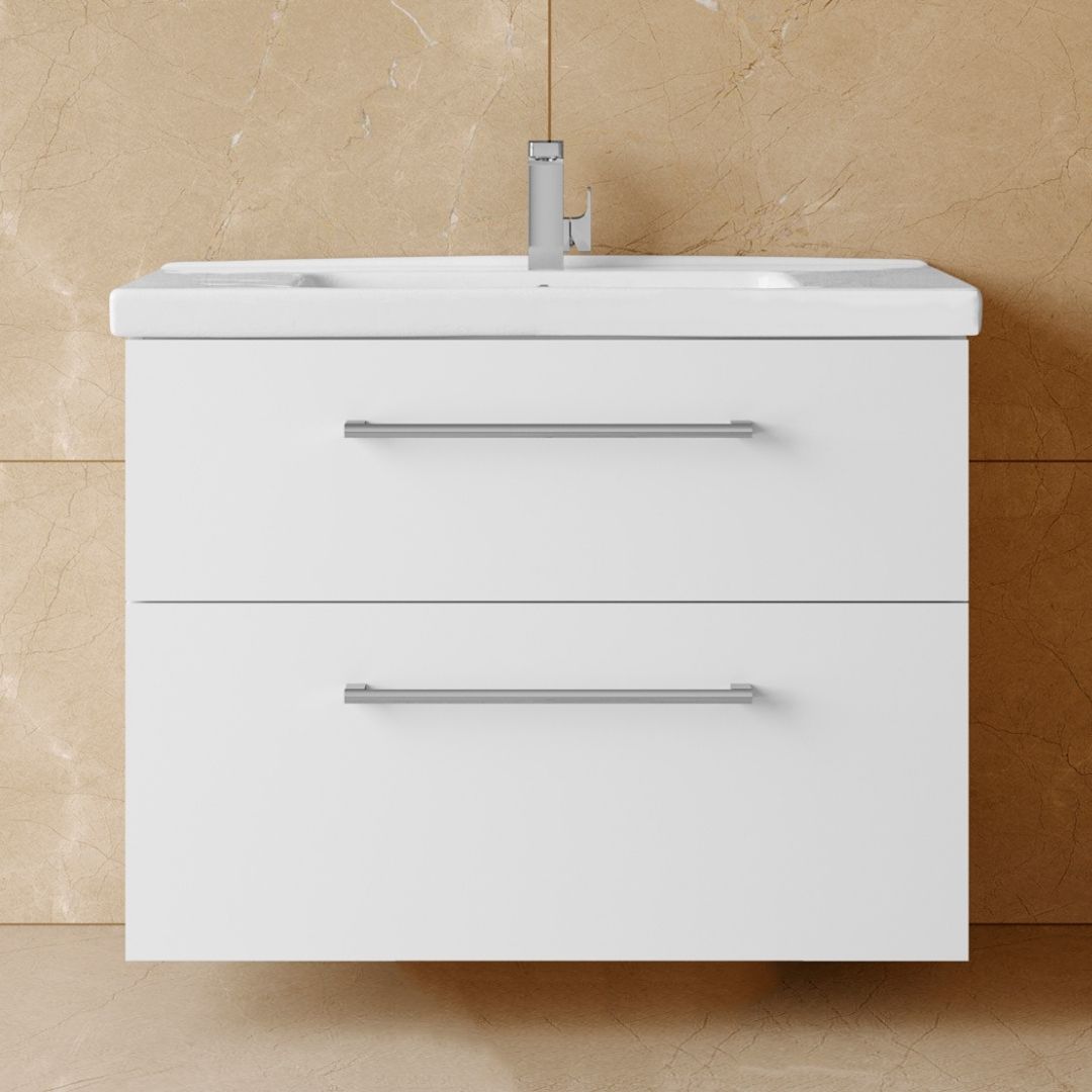 Varianta koupelnové skříně se zásuvkami nad sebou umožňuje pracovat s rozměry na výšku se zachováním úložného prostoru. Na obrázku umyvadlová skříň BIG INN SZZ2 80.