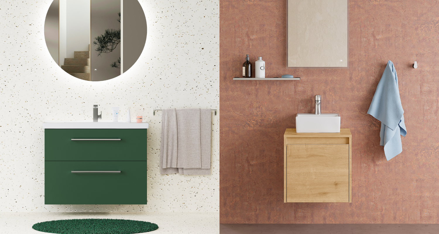 Nalevo nábytkové umyvadlo Harmonia (s umyvadlovou skříňkou BIG INN SZZ2 100), vpravo umyvadlo na desku Gladi (s umyvadlovou skříňkou VISIT SZD 50).
