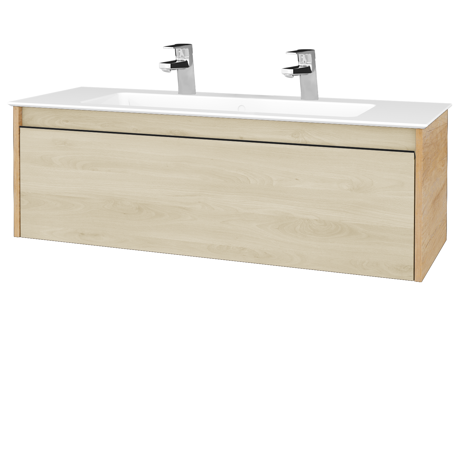 Závěsná umyvadlová skříňka (1200x390x450) s 1 zásuvkou a keramickým umyvadlem Pura 120 se 2 otvory pro baterii Zobrazit více