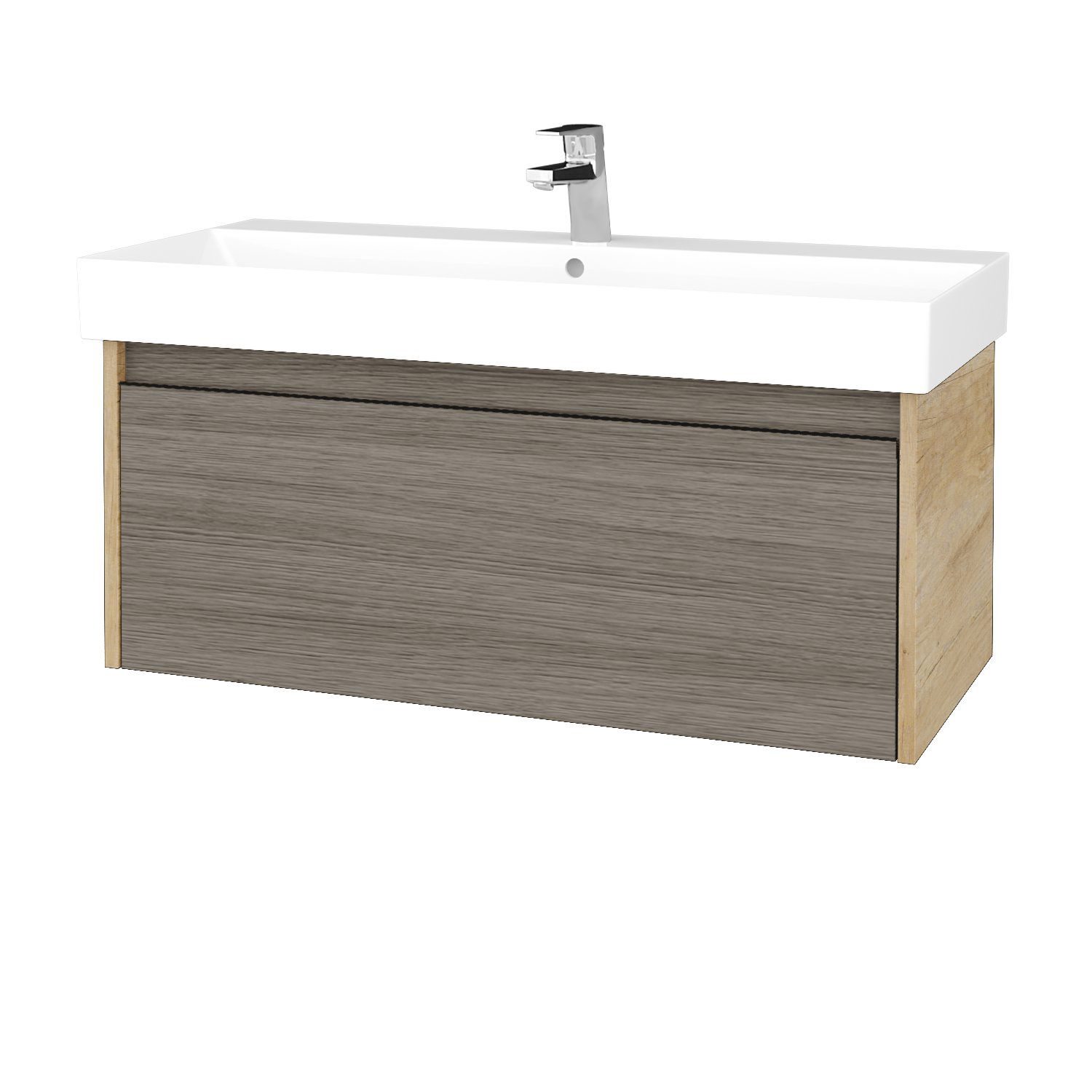 Závěsná umyvadlová skříňka BONO najde své místo v jakékoliv koupelně. Pokud je pro vaši koupelnu ideální šířka 100 cm, pak se pojďme podívat na další aspekty této skříňky, která vyniká čistým designem a prostornou vysokou zásuvkou. Do té snadno uložíte všechny nezbytnosti, a díky pořadačům udržíte na svém místě i drobné předměty. K pohodlnému otevírání zásuvky slouží zafrézovaná úchytka, která nijak neruší celkový design. Úchytku si můžete vybrat ve dvou barvách – černá (T33) a stříbrná (T34). Zásuvka je umístěna na kovových pojezdech německé značky Hettich, na které získáte doživotní záruku. Na celou skříňku se vztahuje naše prodloužená záruka 5 let.