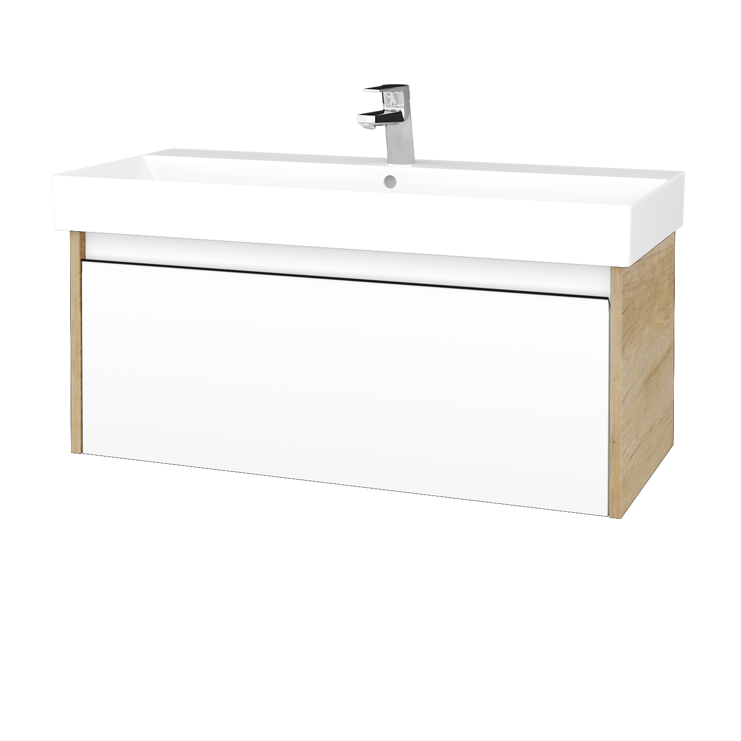 Závěsná umyvadlová skříňka BONO najde své místo v jakékoliv koupelně. Pokud je pro vaši koupelnu ideální šířka 100 cm, pak se pojďme podívat na další aspekty této skříňky, která vyniká čistým designem a prostornou vysokou zásuvkou. Do té snadno uložíte všechny nezbytnosti, a díky pořadačům udržíte na svém místě i drobné předměty. K pohodlnému otevírání zásuvky slouží zafrézovaná úchytka, která nijak neruší celkový design. Úchytku si můžete vybrat ve dvou barvách – černá (T33) a stříbrná (T34). Zásuvka je umístěna na kovových pojezdech německé značky Hettich, na které získáte doživotní záruku. Na celou skříňku se vztahuje naše prodloužená záruka 5 let.