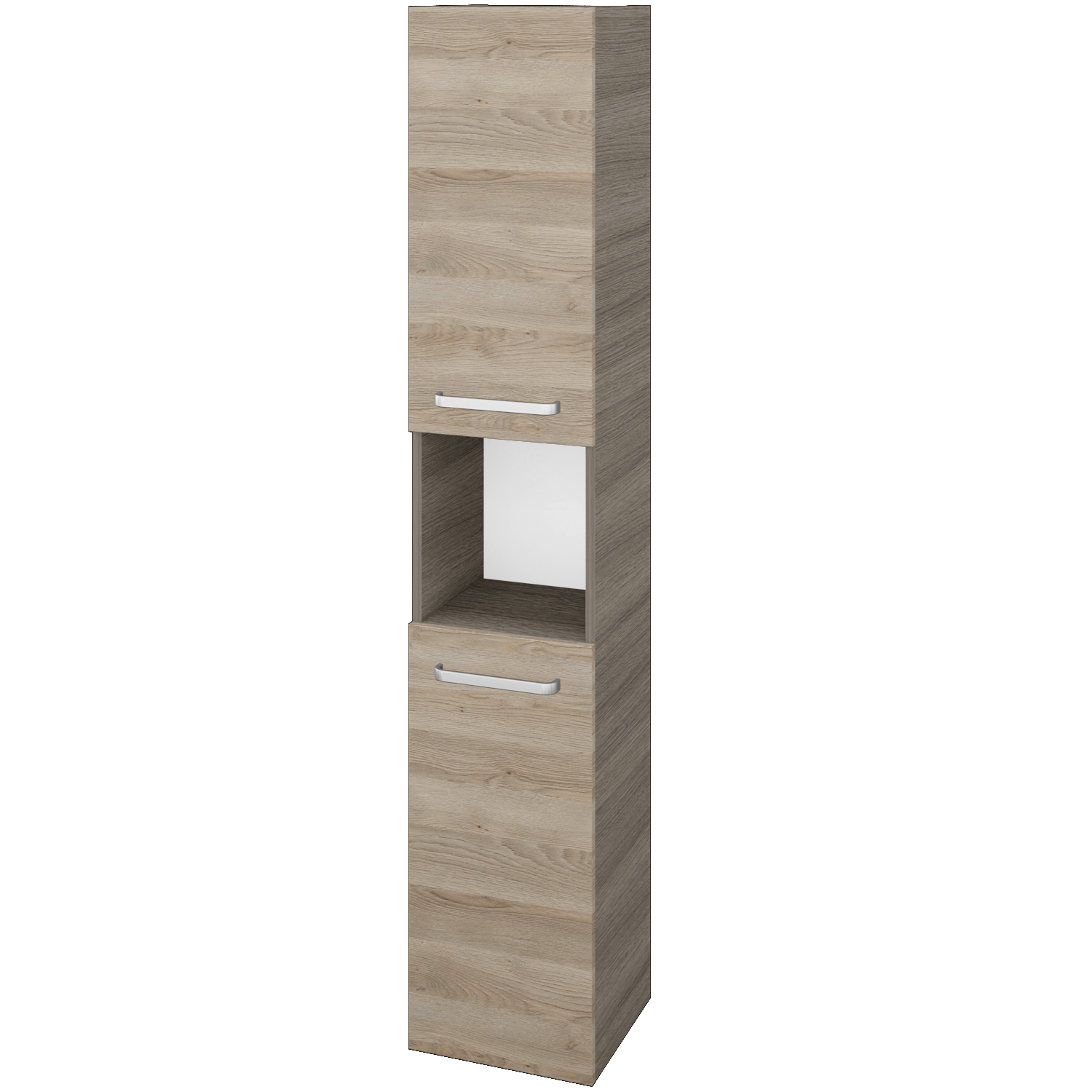 Závěsná vysoká skříň DOS SVD2O 35 je rozdělena na polovinu s praktickou nikou uprostřed, kterou využijete na každodenní drobnosti či malou dekoraci. V každé části za dvířky najdete 2 výškově polohovatelné skleněné police. Směr otevírání dvířek skříňky si můžete zvolit při objednávce. Na dvířka si můžete vybrat z několika úchytek v různých designech či zvolit bezúchytkovou variantu otevírání Push-to-open.