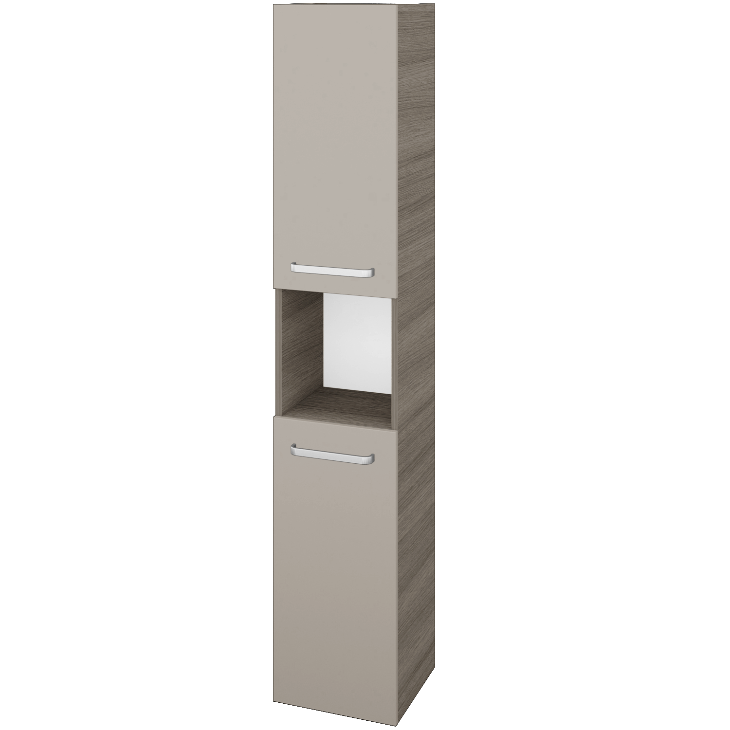 Závěsná vysoká skříň DOS SVD2O 35 je rozdělena na polovinu s praktickou nikou uprostřed, kterou využijete na každodenní drobnosti či malou dekoraci. V každé části za dvířky najdete 2 výškově polohovatelné skleněné police. Směr otevírání dvířek skříňky si můžete zvolit při objednávce. Na dvířka si můžete vybrat z několika úchytek v různých designech či zvolit bezúchytkovou variantu otevírání Push-to-open.