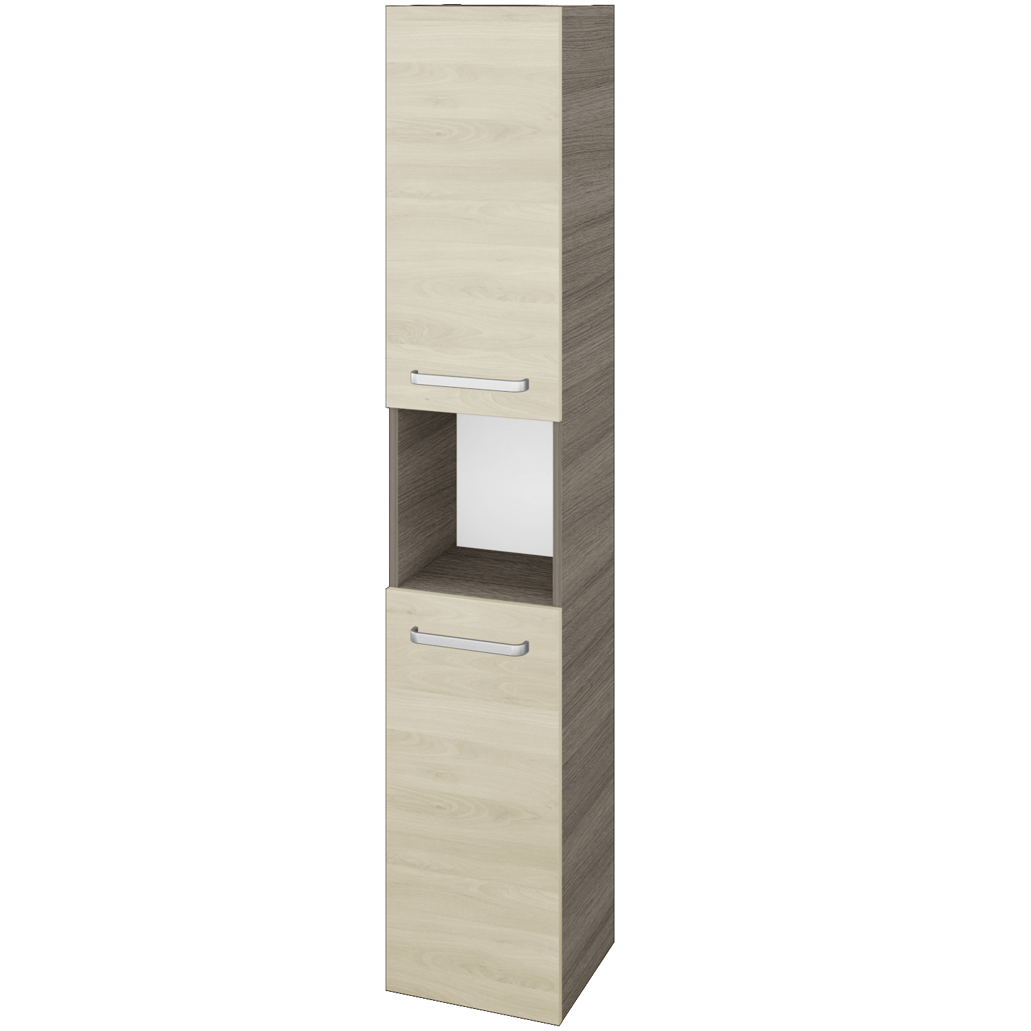 Závěsná vysoká skříň DOS SVD2O 35 je rozdělena na polovinu s praktickou nikou uprostřed, kterou využijete na každodenní drobnosti či malou dekoraci. V každé části za dvířky najdete 2 výškově polohovatelné skleněné police. Směr otevírání dvířek skříňky si můžete zvolit při objednávce. Na dvířka si můžete vybrat z několika úchytek v různých designech či zvolit bezúchytkovou variantu otevírání Push-to-open.