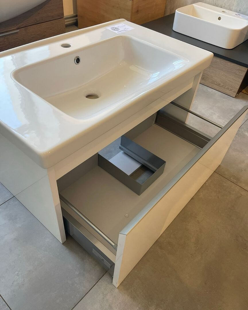 Umyvadlová skříňka BONO SZZ 80 v provedení N01/N01 Bílá leska s keramickým umyvadlem Harmonia 80. Skříňka má jednu prostornou zásuvku s tlumeným odvíráním, které zajišťuje kvalitní kování značky Hettich. Skříňka je bez vady.