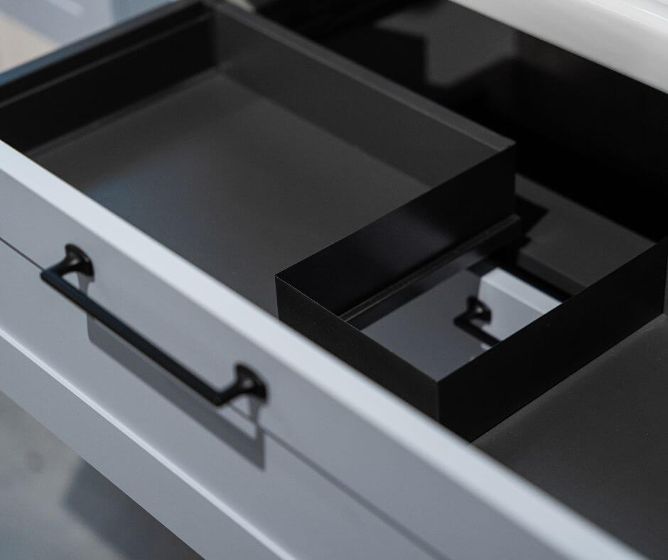 Zásuvky jsou osazeny značkovými pojezdy Hettich, které zajišťují plynulý chod a tiché, tlumené dovírání – stačí je lehce přivřít, o hladké dovření se už postará samotný mechanismus. Na pojezdy Hettich navíc dostanete doživotní záruku, takže se můžete spolehnout na jejich bezchybnou funkčnost po celou dobu užívání.