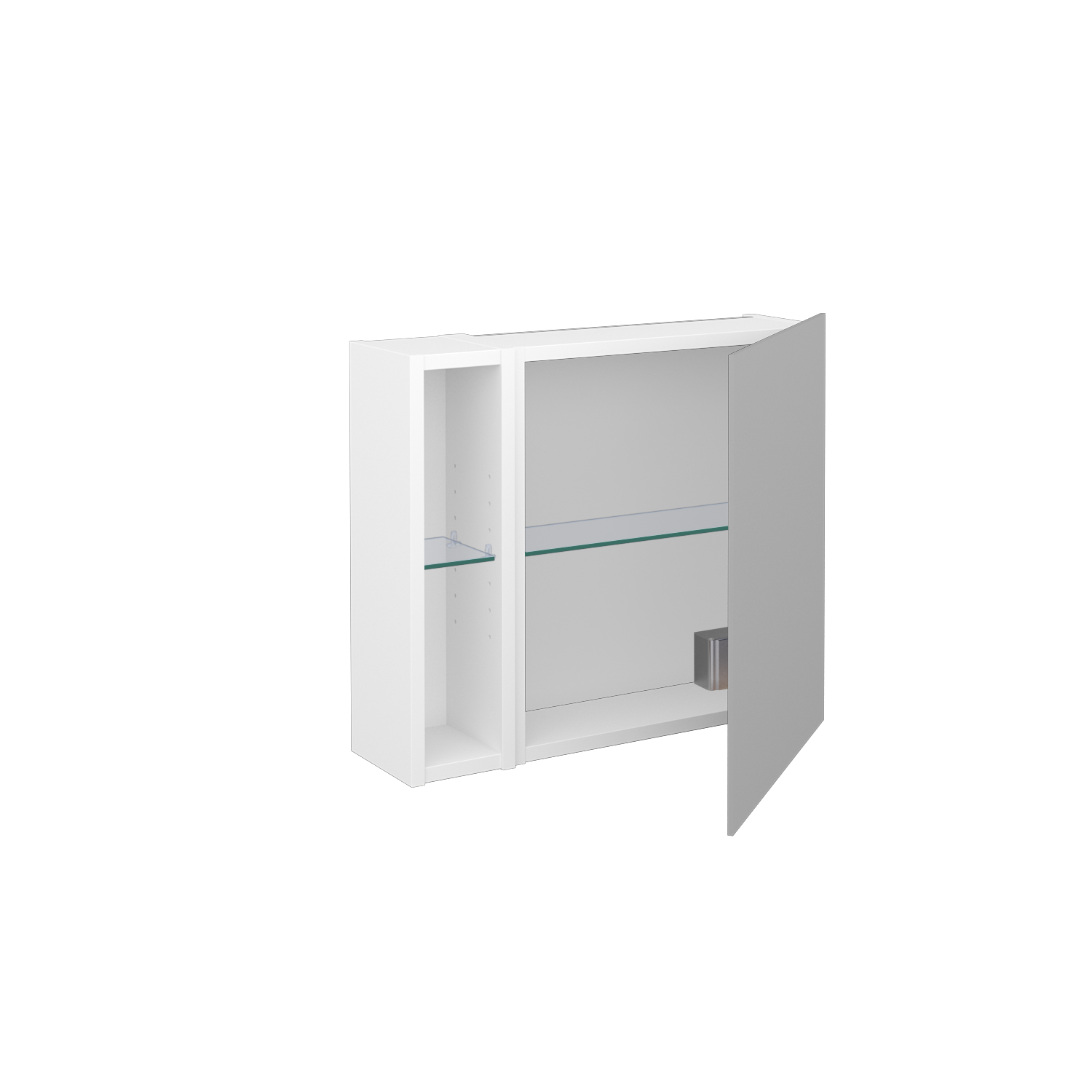 Jednodveřová zrcadlová skříňka (700x530x163) s nikou vpravo a 2 skleněnými policemi, vypínačem a…