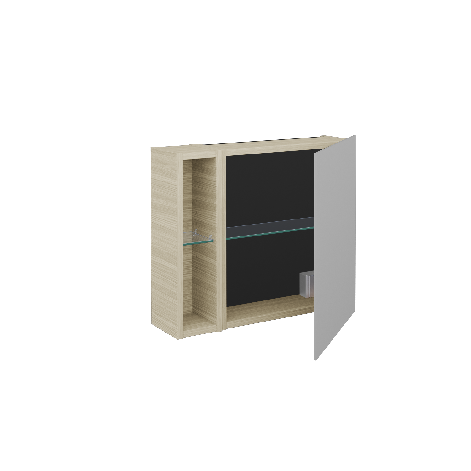 Jednodveřová zrcadlová skříňka (600x530x163) s nikou vlevo a 2 skleněnými policemi, vypínačem a…