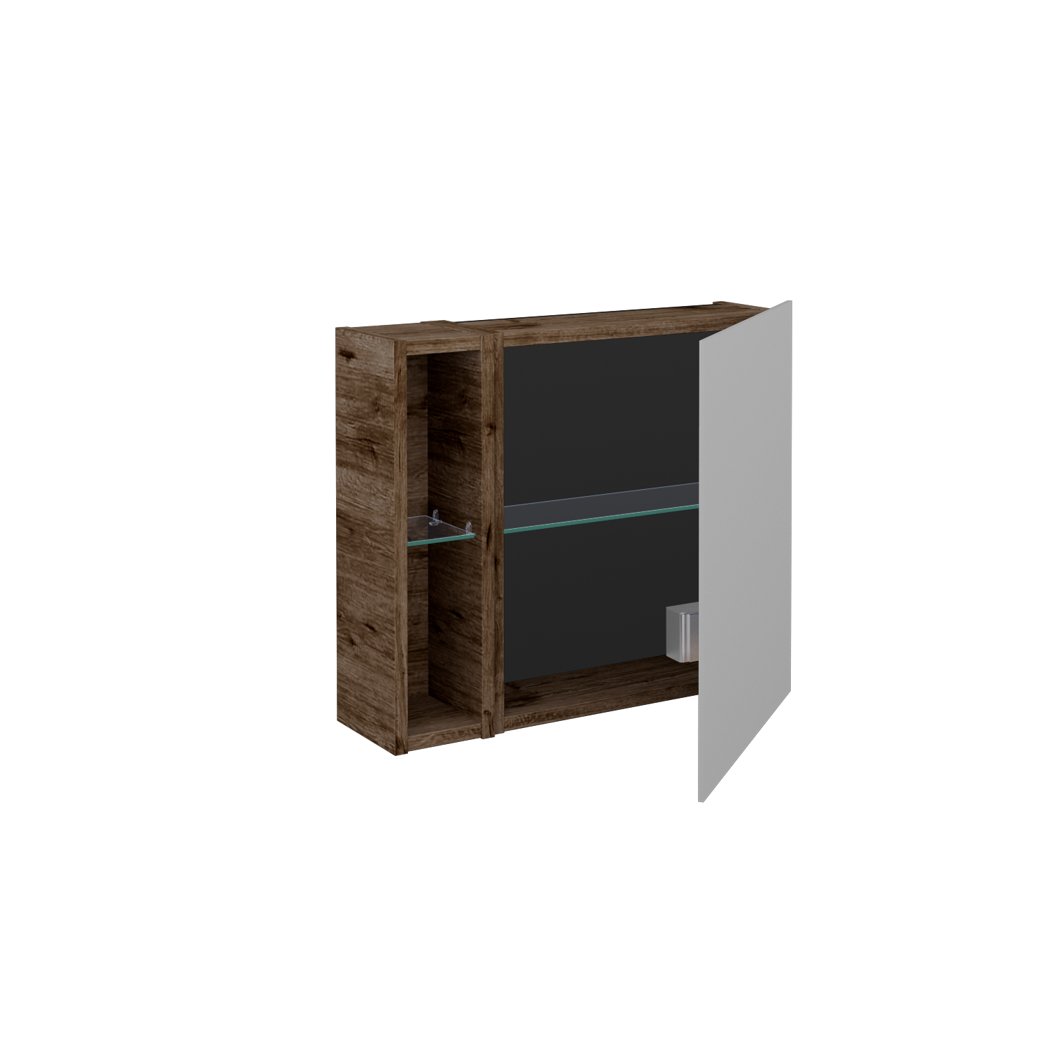 Jednodveřová zrcadlová skříňka (600x530x163) s nikou vlevo a 2 skleněnými policemi, vypínačem a zásuvkou Zobrazit více