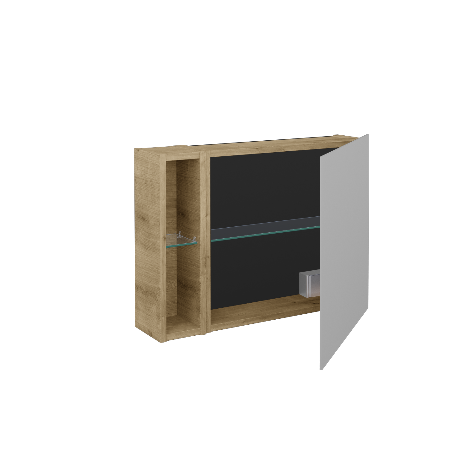 Jednodveřová zrcadlová skříňka (700x530x163) s nikou vlevo a 2 skleněnými policemi, vypínačem a zásuvkou Zobrazit více