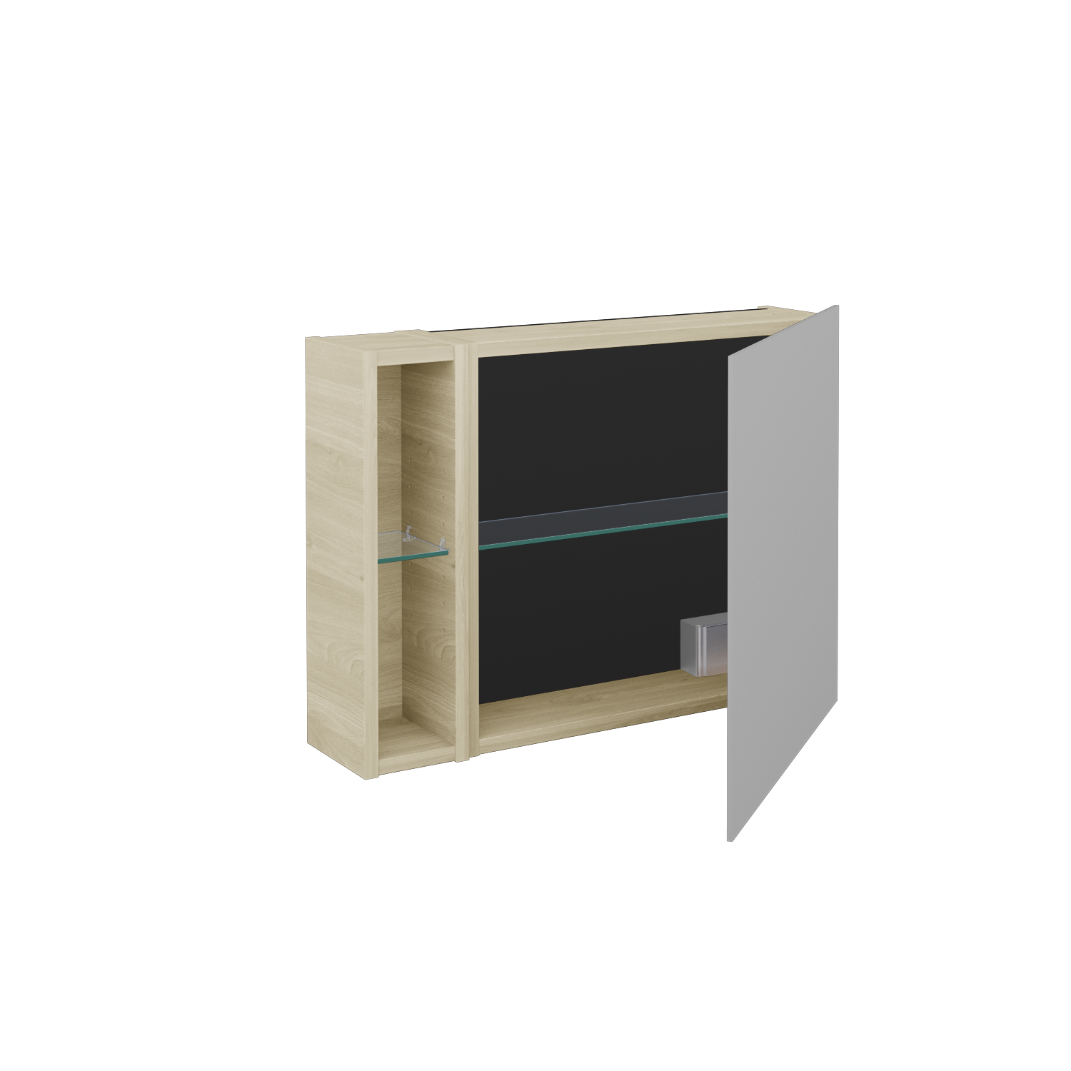 Jednodveřová zrcadlová skříňka (700x530x163) s nikou vlevo a 2 skleněnými policemi, vypínačem a zásuvkou Zobrazit více