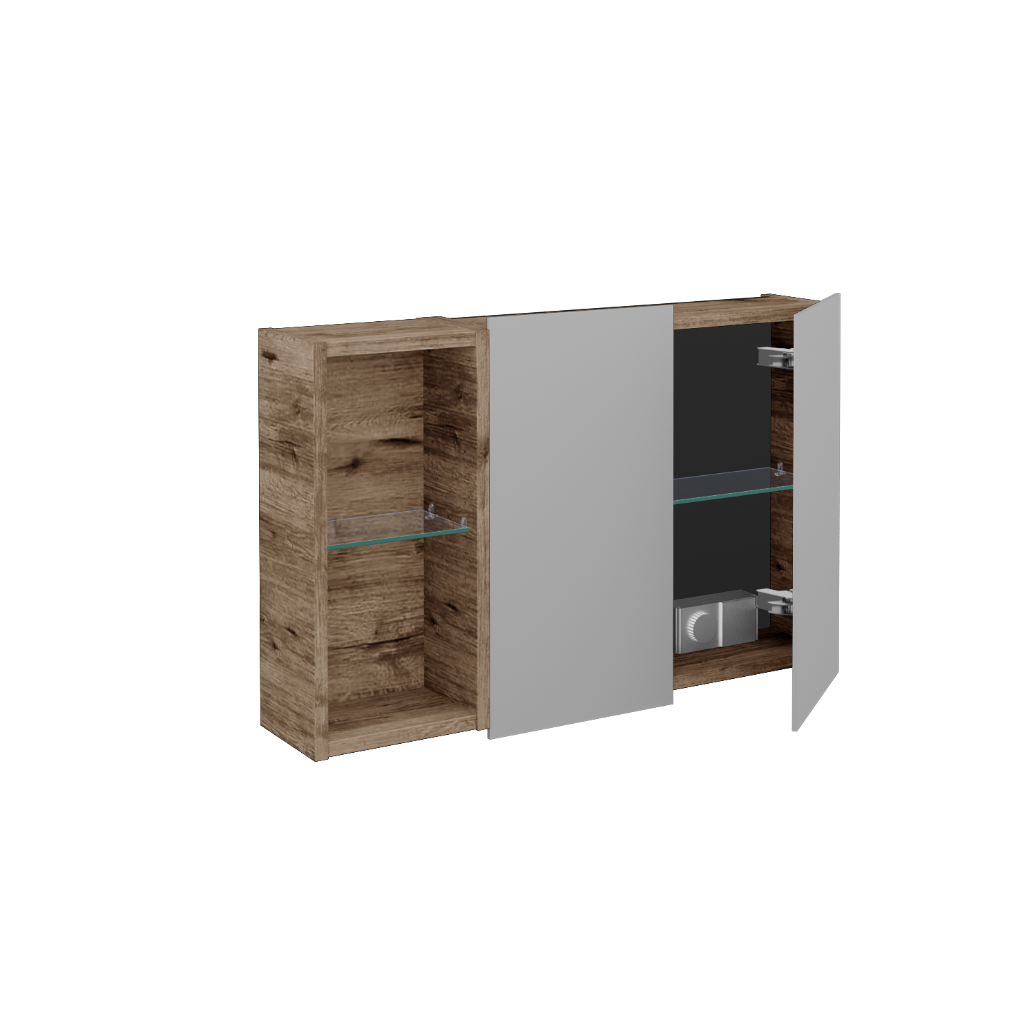 Dvoudveřová zrcadlová skříňka (800x530x163) s nikou vlevo a 2 skleněnými policemi, vypínačem a zásuvkou Zobrazit více