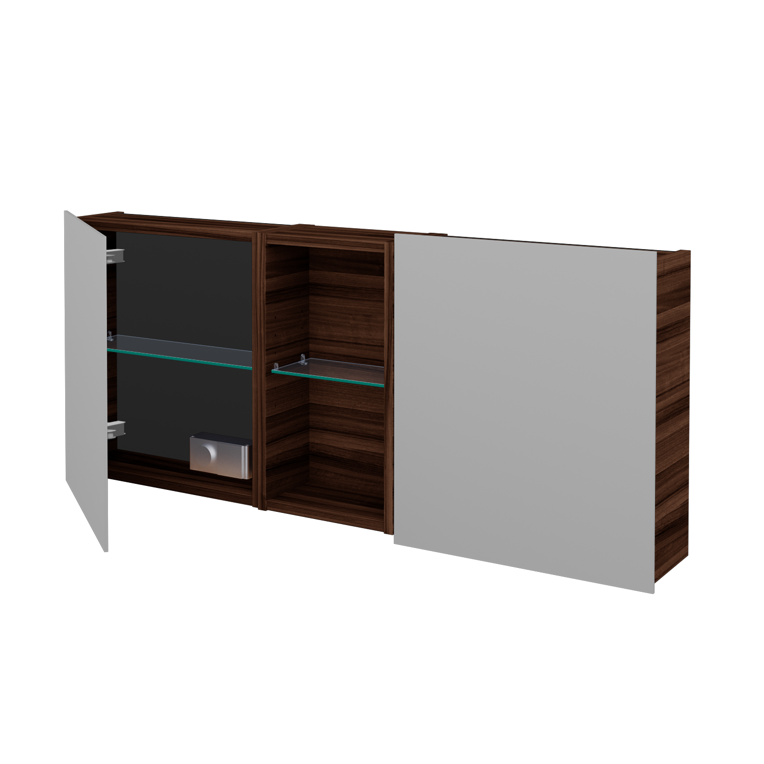 Po stranách niky najdete prostor s oboustrannými zrcadlovými dvířky, která se pohodlně otevírají za spodní přesah. Dvířka jsou uchycena pomocí naší patentované lišty a osazena panty Hettich s tlumeným dovíráním, na které výrobce poskytuje doživotní záruku. V každé ze tří částí je umístěna 1 skleněná police, takže uspořádání je přehledné a vyvážené. V uzavřených částech se navíc nachází zásuvka a vypínač pro externí osvětlení, přičemž celé provedení splňuje krytí IP44, takže je bezpečné i v prostředí s vysokou vlhkostí.