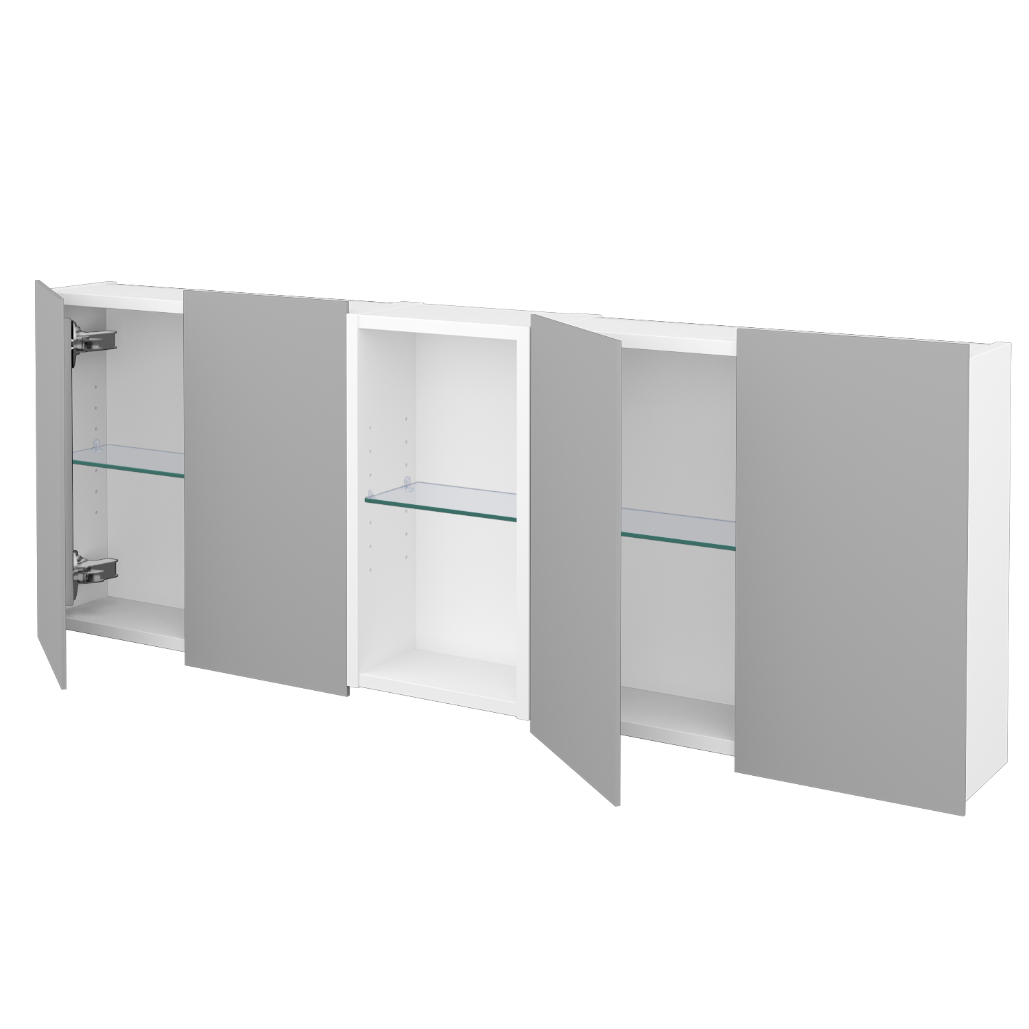 Po stranách niky se nachází uzavřené části s oboustrannými zrcadlovými dvířky, která se pohodlně otevírají za decentní spodní přesah. Dvířka jsou uchycena na naší patentované liště a osazena kvalitními panty Hettich s tlumeným dovíráním, na které se vztahuje doživotní záruka výrobce. V každé ze tří částí je umístěna 1 skleněná police, díky čemuž je vnitřní uspořádání přehledné a funkčně vyvážené. V uzavřených částech se navíc nachází zásuvka a vypínač pro externí osvětlení a celé provedení splňuje krytí IP44, takže je bezpečné i pro použití v koupelnách s vyšší vlhkostí.