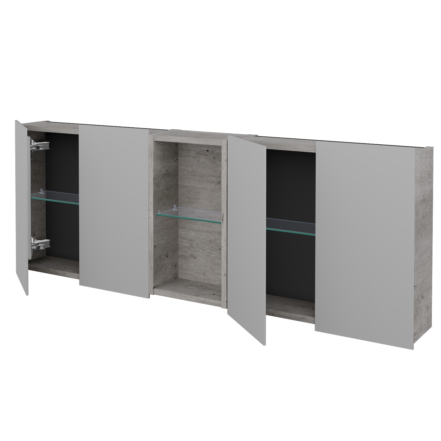 Po stranách niky se nachází uzavřené části s oboustrannými zrcadlovými dvířky, která se pohodlně otevírají za decentní spodní přesah. Dvířka jsou uchycena na naší patentované liště a osazena kvalitními panty Hettich s tlumeným dovíráním, na které se vztahuje doživotní záruka výrobce. V každé ze tří částí je umístěna 1 skleněná police, díky čemuž je vnitřní uspořádání přehledné a funkčně vyvážené. V uzavřených částech se navíc nachází zásuvka a vypínač pro externí osvětlení a celé provedení splňuje krytí IP44, takže je bezpečné i pro použití v koupelnách s vyšší vlhkostí.