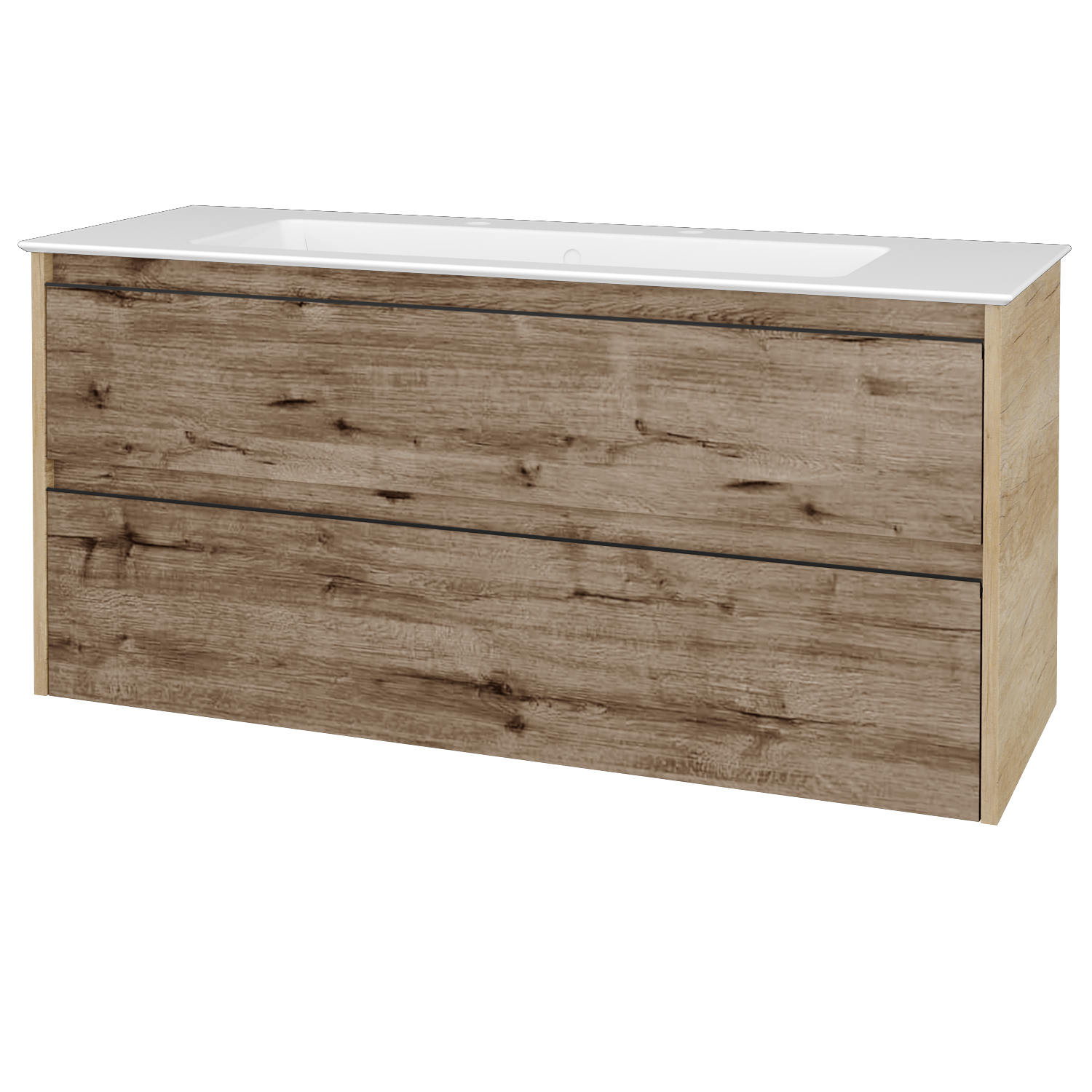 Umyvadlová skříňka (1200x390x445) se 2 zásuvkami pod sebou a keramickým umyvadlem Pura 120 se 2 otvory pro baterii Zobrazit více