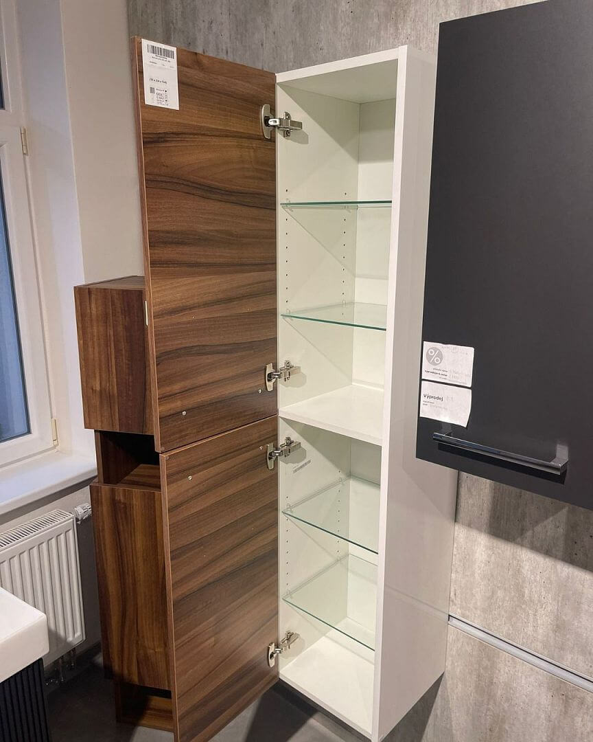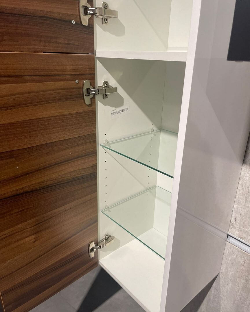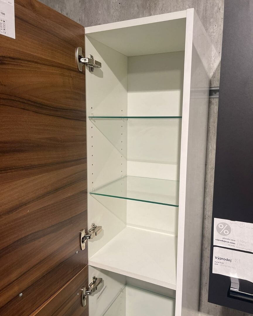Závěsná vysoká skříň DOS SVD2 35 je rozdělena dvířky na polovinu. V každé části najdete 2 výškově nastavitelné skleněné police. Směr otevírání dvířek skříňky je levé. I ve vysokých skříňkách používáme německé kování Hettich, které zajišťuje tlumené dovírání. Skříňka je vyrobena v kombinaci N01 Bílá lesk a D06 Ořech.