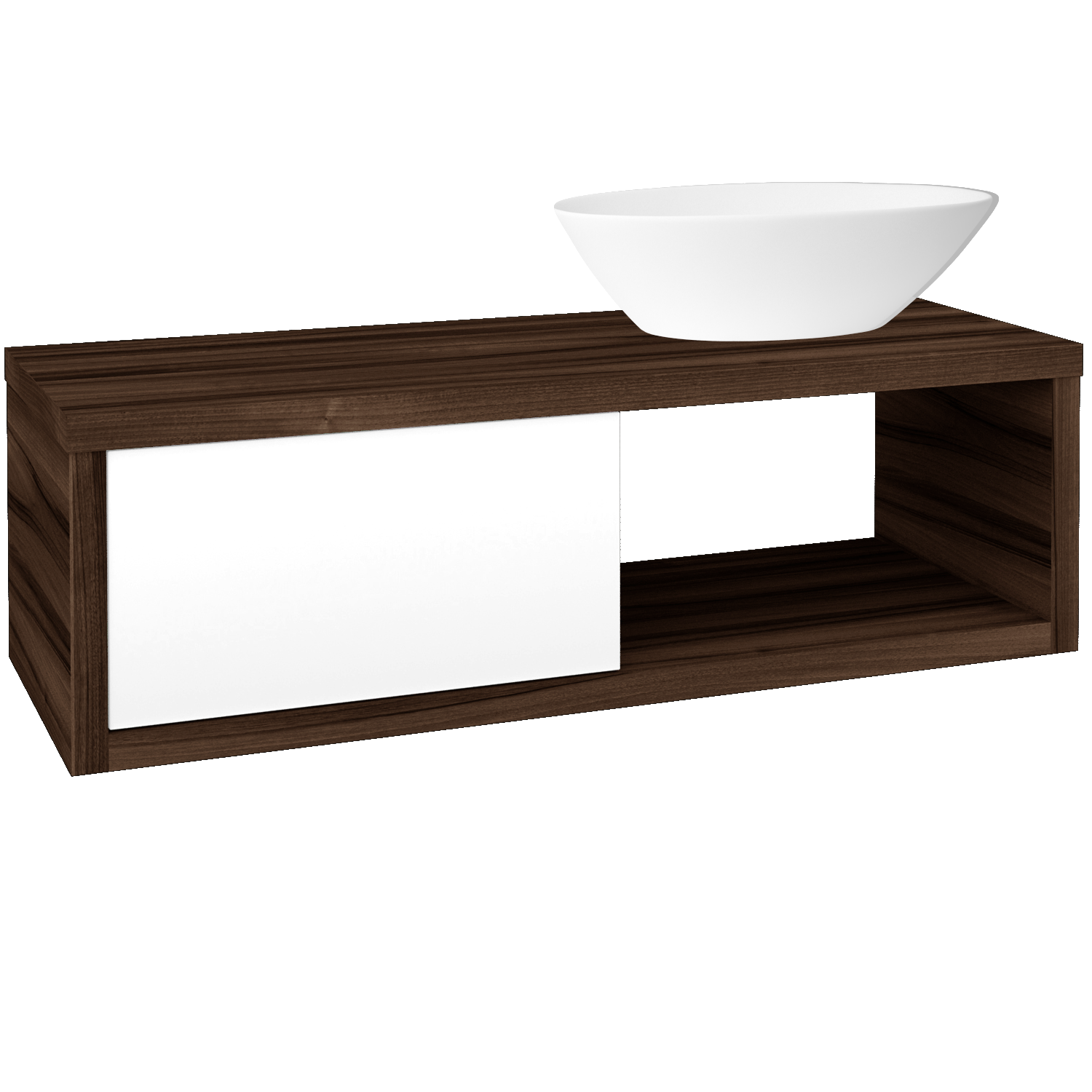 Skříňka je vyroena v barevné kombinaci D06 Ořech a L01 Bílá vysoký lesk. Umyvadlo s nikou je umístěno vpravo.