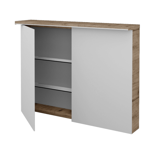 Dvoudveřová zrcadlová skříňka ASTON GAO2E 100 vás na první pohled překvapí množstvím zrcadlové plochy na oboustranně zrcadlových dvířkách, která jsou ke korpusu galerky připevněna pomocí naší patentované lišty a kování značky Hettich. Dvířka se otevírají v dolní části za přesah a díky značkovému kování mají pohodlné a tlumené dovírání.
