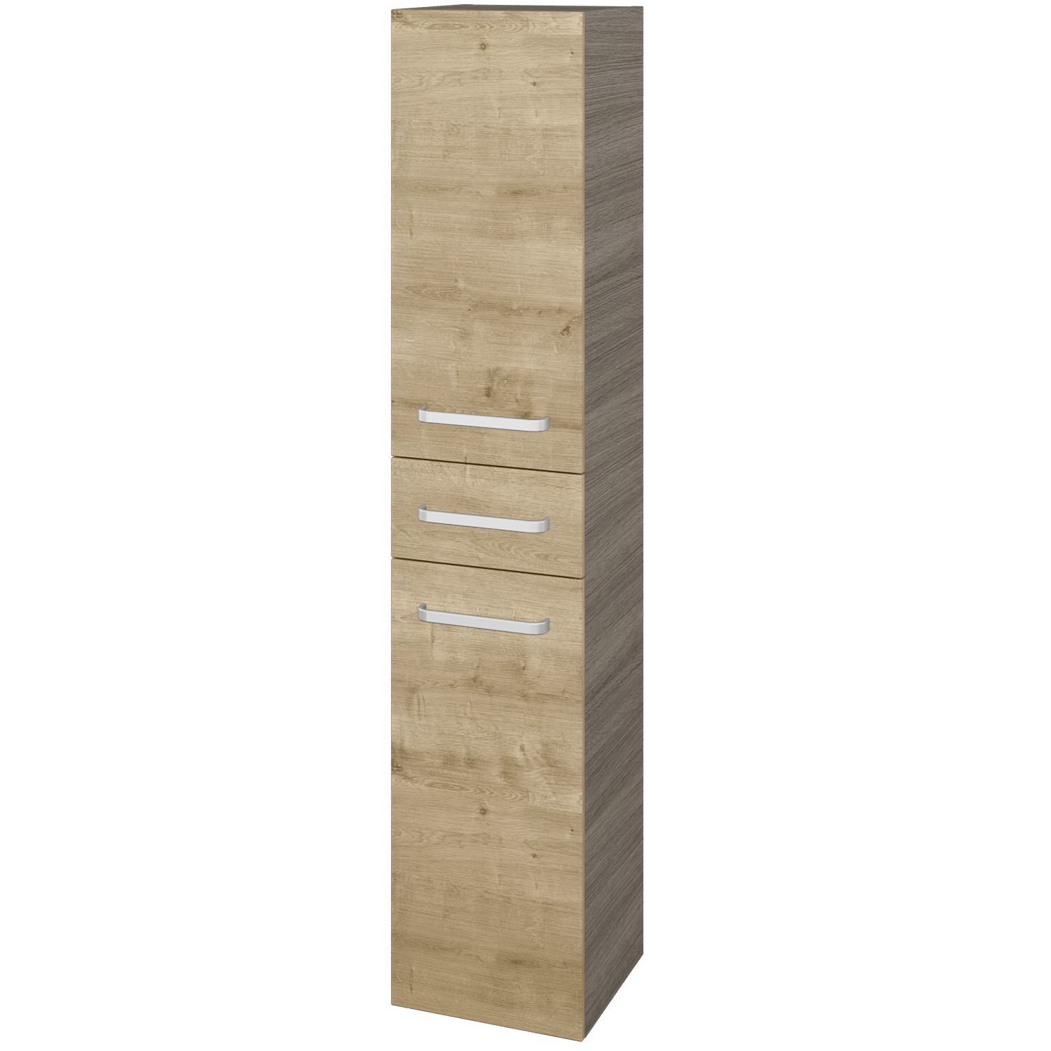 Závěsná vysoká skříň DOS SVD2Z 35 je rozdělena dvířky na polovinu. V každé části najdete 2 výškově polohovatelné skleněné police. Uprostřed skříňky je také zásuvka, která je svou velikostí i přístupností ideální k uložení každodenních maličkostí. Vysoká skříň v koupelně představuje mnoho úložného prostoru i přes malé rozměry. Směr otevírání dvířek skříňky si můžete zvolit při objednávce, stejně jako úchytky, které budou nejlépe sedět k dalšímu vybavení koupelny.