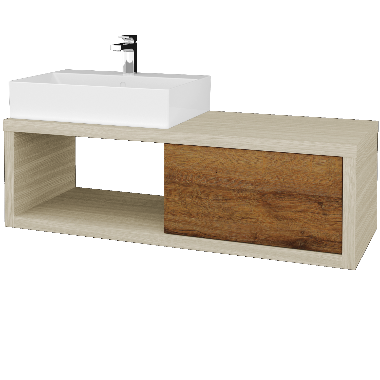Závěsná umyvadlová skříňka (1200x370x500) s 1 zásuvkou, nikou a keramickým umyvadlem Kube Zobrazit více